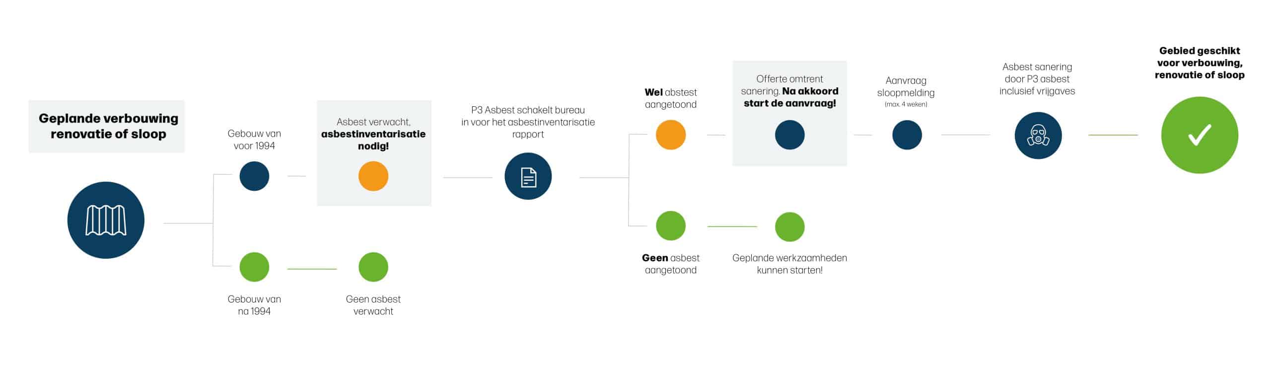 Gaat u binnenkort verbouwen, renoveren of slopen en twijfelt u over asbest? Bekijk onze beslisboom voor onze gedetailleerde stappen.